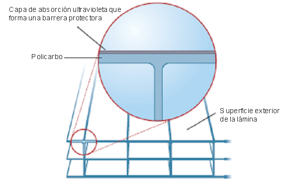 - Protección efectiva contra la radiación ultravioleta. El policarbonato filtra el 98% de la radiación UV.
