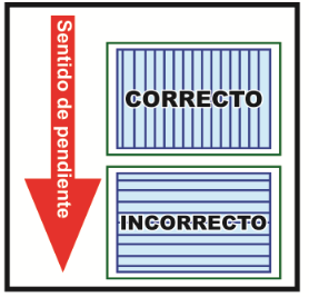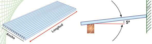 - Instalar la plancha de tal manera que los alveolos queden inclinados con una pendiente mínima. Cuando el alveolo tiene pendiente el agua que se forme por la condensación va a poder fluir por gravedad y salir de los alveolos interiores. NUNCA INSTALE LA PLANCHA DEJANDO LOS ALVEOLOS EN FORMA HORIZONTAL.