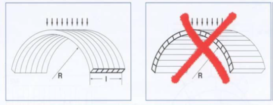 a. Dimensionamiento para techos curvos: La estructura generalmente se realiza con tubos de metal 2” x 1” que se mandan a rolar para darles la curvatura deseada. Considere el radio mínimo de curvatura que le puede dar al arco y las correas de apoyo dependiendo del espesor de la plancha que utilice, de acuerdo a lo siguiente: