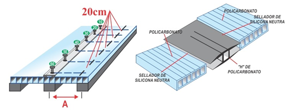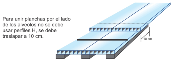 Para unir planchas de policarbonato se utilizan los conectores (Perfiles H). Estos solamente se deben de utilizar por el lado longitudinal de la lámina, si va unir por el lado transversal de la plancha (alveolos expuestos) se debe traslapar.