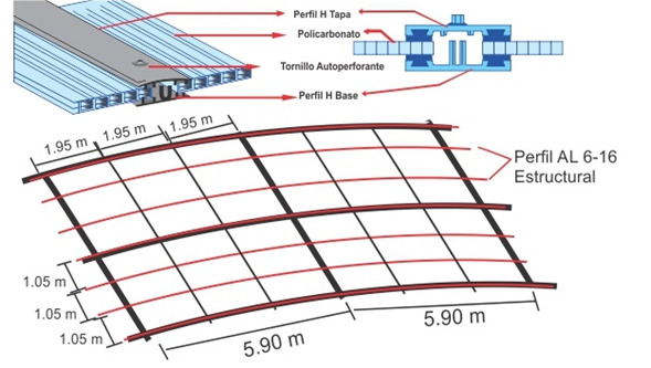 Para las uniones entre planchas se utiliza los perfiles H Clip de Policarbonato (se pueden curvear) o los perfiles H TAPA con gomas de EPDM. No se recomienda usar H simple de policarbonato (salvo techos menores de 3 m. de largo del arco).