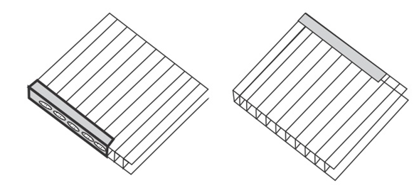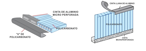 - Se cortan las planchas de acuerdo al diseño de la estructura, cuidando que las uniones entre planchas se ubiquen sobre la estructura de soporte. Se retiran los films protectores de las planchas, luego se encintan los alveolos con los perfiles U. Entre la plancha y la estructura para un mejor sellado se puede usar cintas de butil o de doble contacto.