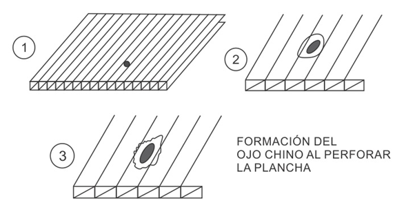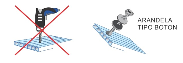 En lo posible se debe evitar perforar la plancha con pernos autoperforantes con volandas de neoprene porque la plancha de policarbonato tiene un elevado coeficiente de dilatación. Con las constantes dilataciones y contracciones de la lámina se van formando ojos chinos alrededor de los pernos autoperforantes con volandas de neoprene. Muchos instaladores usan silicona neutra para sellar alrededor de los pernos autoperforantes, pero con los movimientos ocasionados por las dilataciones estos sellamientos se van desprendiendo y dejando expuestos los alveolos.