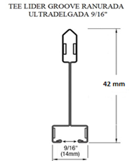 Suspensión especial ultra delgada 9/16″ RANURADA de acero galvanizado. Para trabajo pesado. Las tees tiene una ranura longitudinal que le da una apariencia diferente. Los angulos perimetrales tienen un espesor de chapa de 0.45 mm . Que le da mayor rigidez y durabilidad. (Es 12% de más espesor que las normales) de 0.40 mm. Puede ser usada con cualquier tipo de baldosa de borde recto.